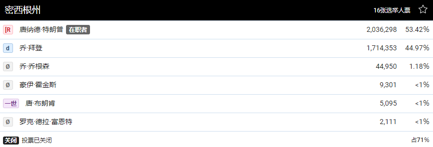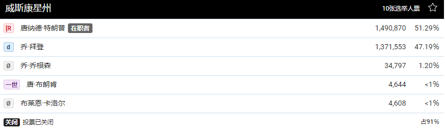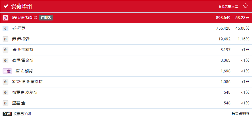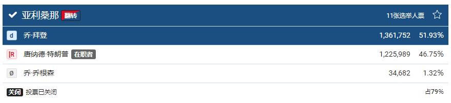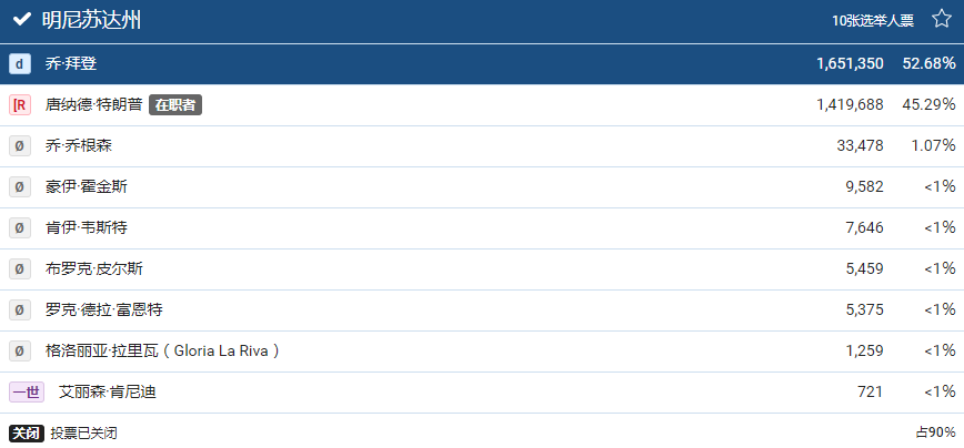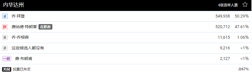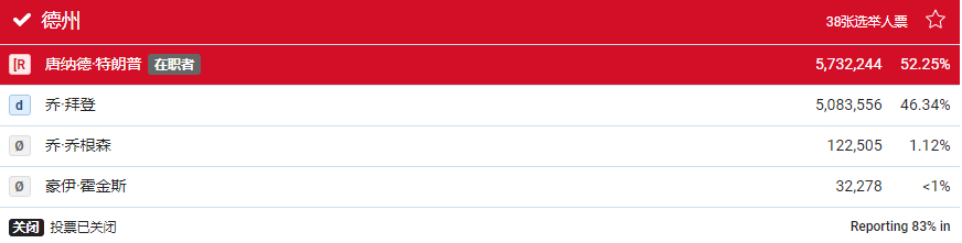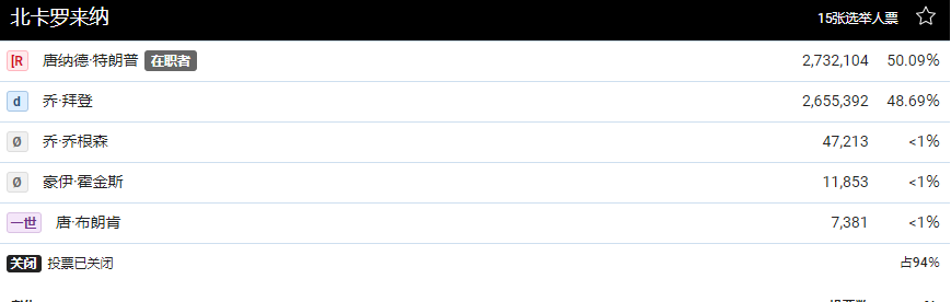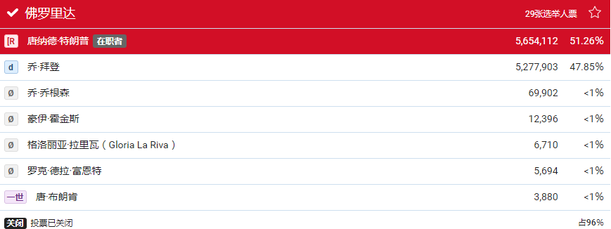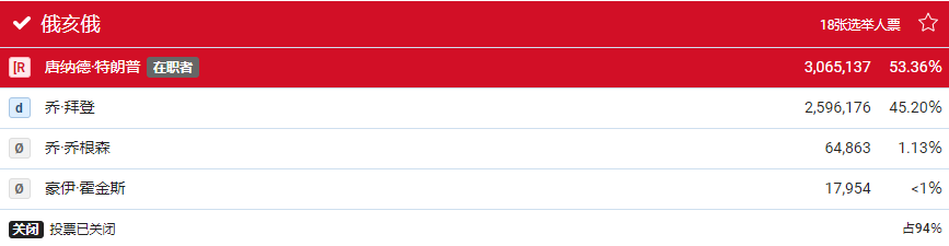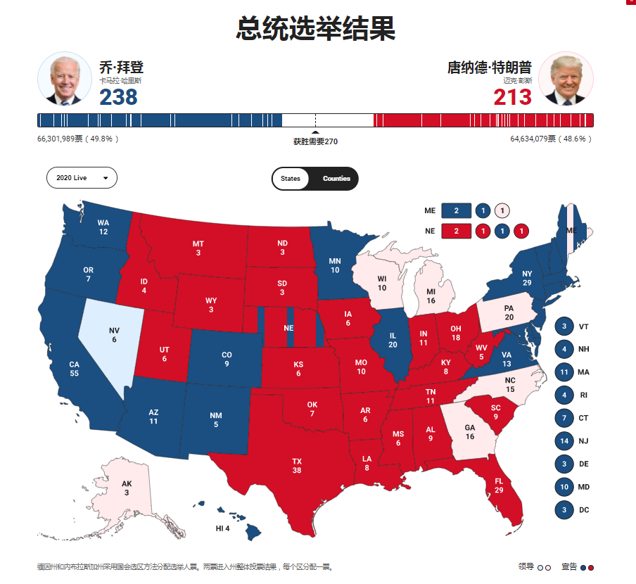 截止北京時間15:35,美國總統大選投票最新統計結果如下: