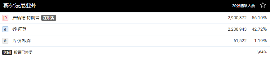 賓夕法尼亞(ya) 州:特朗普領先(勝選+20)
