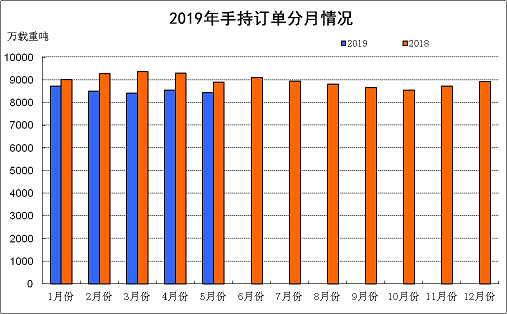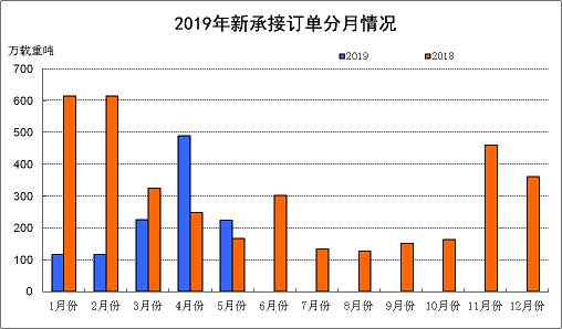 1~5月份,全國造船完工1666萬(wan) 載重噸,同比增長1.4%。承接新船訂單1173萬(wan) 載重噸,同比下降40%。5月底,手持船舶訂單8439萬(wan) 載重噸,同比下降5.5%,比2018年底下降5.5%。