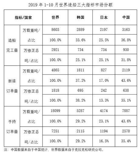 1~10月份,全國造船完工3163萬(wan) 載重噸,同比增長4.6%。承接新船訂單2119萬(wan) 載重噸,同比下降25.6%。10月底,手持船舶訂單7887萬(wan) 載重噸,同比下降7.7%,比2018年底下降11.7%。