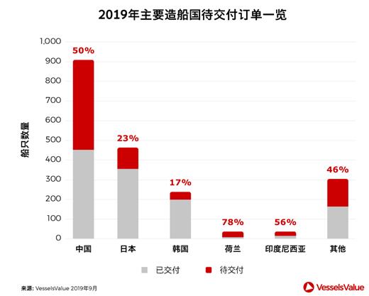 中國同時也是待交付船隻最多的國家,占其2019年訂單總量的50%。