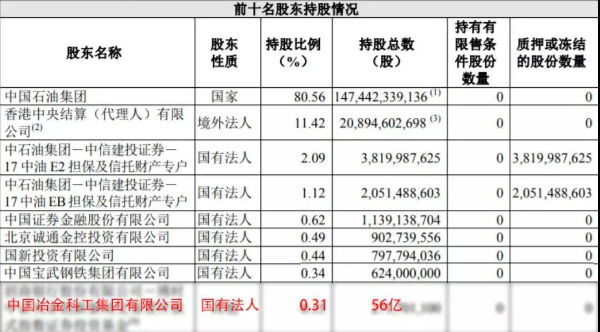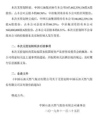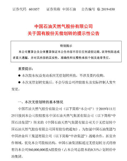11月25日,中國石油發布公告,為(wei) 加強中國石油集團與(yu) 中冶集團戰略合作,拓寬合作領域,優(you) 化公司股權結構,控股股東(dong) 中國石油集團擬通過無償(chang) 劃轉方式將持有的中國石油股份公司5.6億(yi) 股A股股份(占公司總股本的0.31%)劃轉給中冶集團。5.6億(yi) 股對應32億(yi) 的市值。