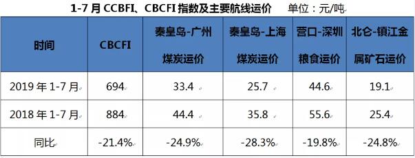 年初以來,受多重利空因素衝(chong) 擊沿海幹散貨市場表現不及預期,在諸如中美貿易摩擦升級、國內(nei) 宏觀經濟下行壓力加大、上年二手運力進口衝(chong) 擊顯現等因素影響下,市場總體(ti) 呈現低位震蕩徘徊的走勢。1-7月份,沿海煤炭運價(jia) 指數CBCFI均值694點,同比下跌了21.4%,沿海主要航線運價(jia) 同比上年同期亦大幅下跌。