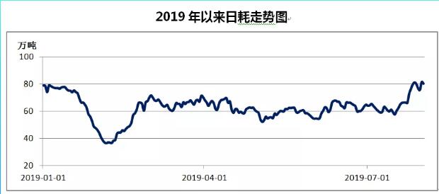 隨著氣溫的走高,居民用電增加,沿海主要電廠耗煤量迎來階段性快速上漲,達今年以來最高值。截至8月1日,沿海六大電廠庫存1747.9萬(wan) 噸,周環比減少8.1萬(wan) 噸;日耗煤80.6萬(wan) 噸,周環比增加3.8萬(wan) 噸;可用天數為(wei) 21.7天,周環比減少1.2天。