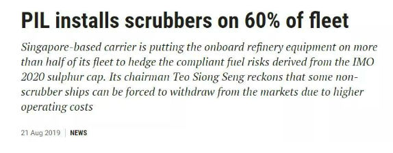 據外媒報道,太平船務60%的船舶正安裝廢氣洗滌裝置,以應對即將實施的全球限硫令。目前,太平船務共運營120艘船舶,大多為(wei) 中小型船舶。