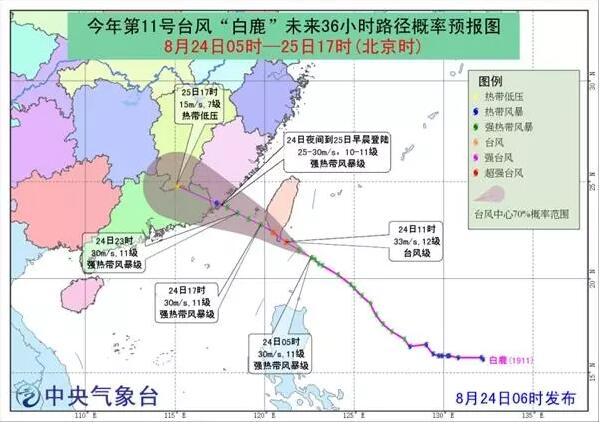 中央氣象台8月24日06時繼續發布台風黃色預警: