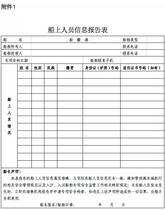 固定或長期在管控水域航行、停泊、作業(ye) 的船舶,應於(yu) 10月11日前向所在地海事管理機構申請專(zhuan) 項安全檢查,提交《船上人員信息報告表》和《船舶信息報告表》,並報備停泊地點和作業(ye) 水域。期間,船舶信息和船上人員信息發生變化的應予重新報送。