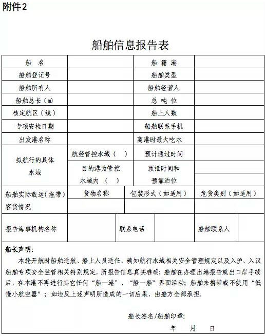 擬進入管控水域的中國籍船舶,應在抵達管控水域的上一港口向所在地海事管理機構進行專(zhuan) 項信息報告,提交經船長簽字確認的《船上人員信息報告表》(附件1)、《船舶信息報告表》(附件2)以及海事管理機構開展專(zhuan) 項安全檢查時出具的《船舶專(zhuan) 項安全檢查項目表》;上一港為(wei) 境外港口的,應在辦理進口岸手續時進行上述報告。