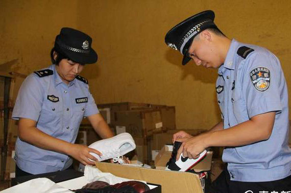 海關(guan) 緝私警察清點查獲的走私運動鞋。