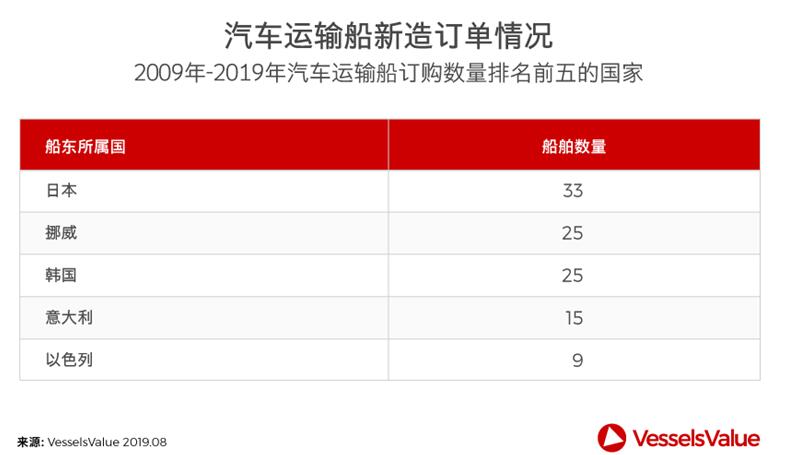 日本船東(dong) 在汽車運輸船市場仍名列前茅,在過去10年共訂購了33艘汽車運輸船。這並不令人驚訝,因為(wei) 日本是全球第二大汽車出口國,僅(jin) 在2018年交易量就達到990億(yi) 美元(約占全球總量的13%)。
