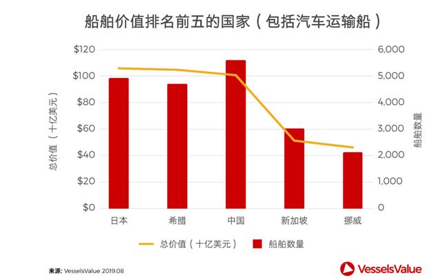 在汽車運輸船的船舶價(jia) 值納入VesselsValue的估值係統後,最大的船東(dong) 國的排名發生了明顯變化。此前,希臘雄踞榜首,領先於(yu) 中國和日本。然而,日本憑借龐大的汽車運輸船隊,所擁有的船舶資產(chan) 總值目前已超越希臘和中國,躍居首位。