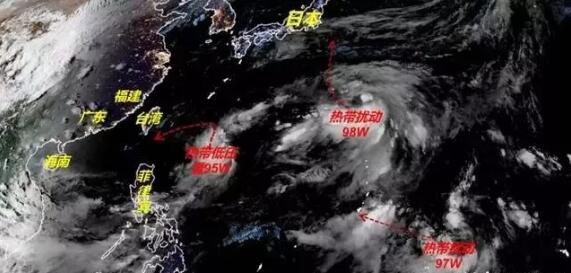 ▲9月13日傍晚,葵花-8號衛星監測到的西北太平洋上空三個(ge) 熱帶係統。