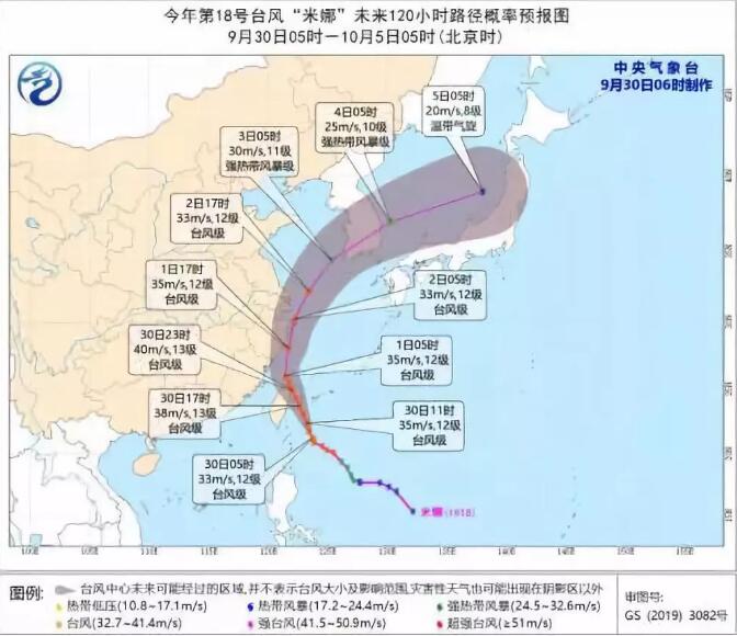 大風預報:30日08時至10月1日08時,巴士海峽、台灣海峽、台灣以東(dong) 洋麵、南海東(dong) 北部、東(dong) 海、台灣島沿海、福建沿海、浙江沿海將有6-7級大風,其中,部分海域或地區將有8-10級大風,“米娜”中心經過的附近海域的風力有11-14級,陣風15-16級。