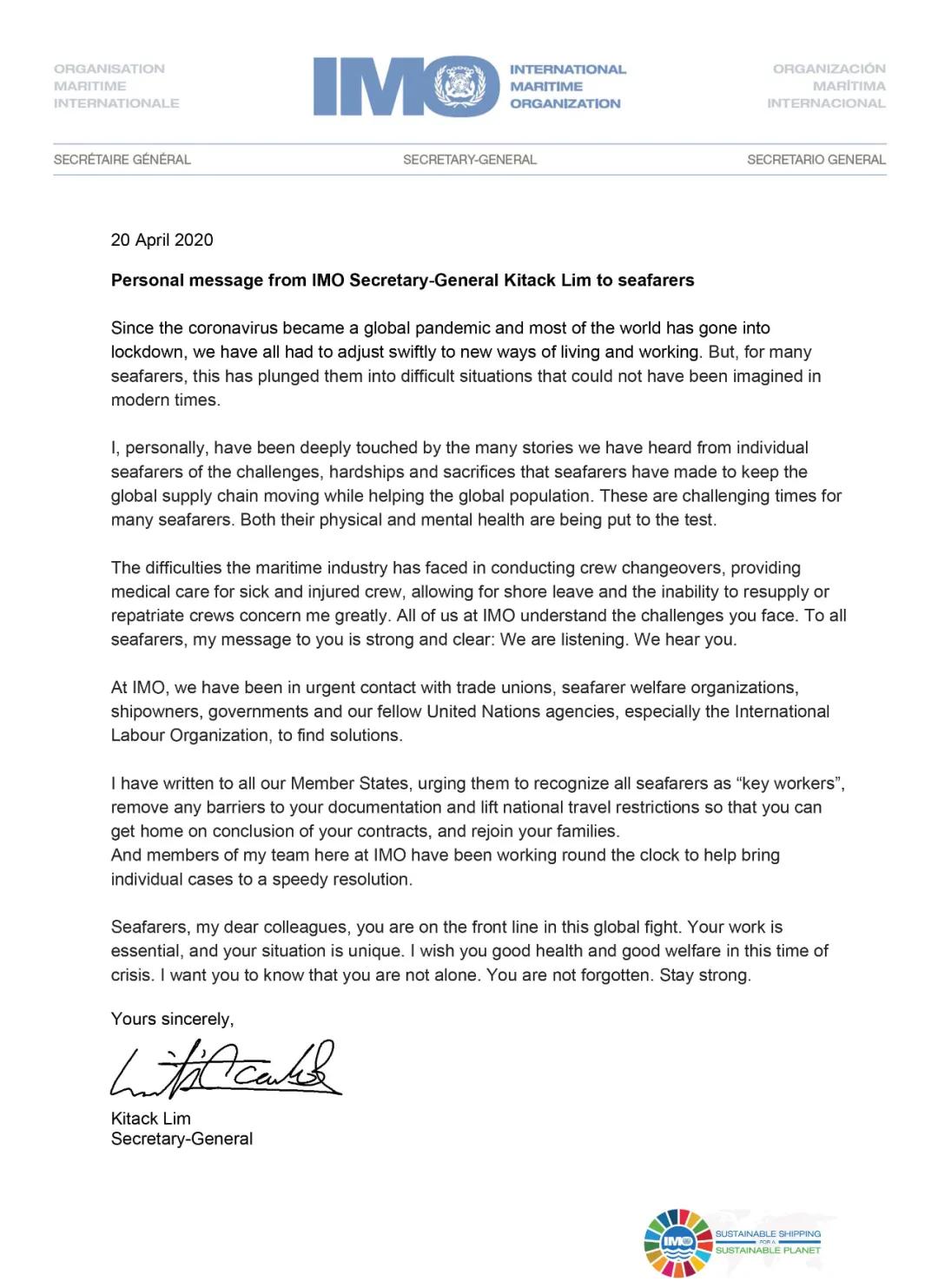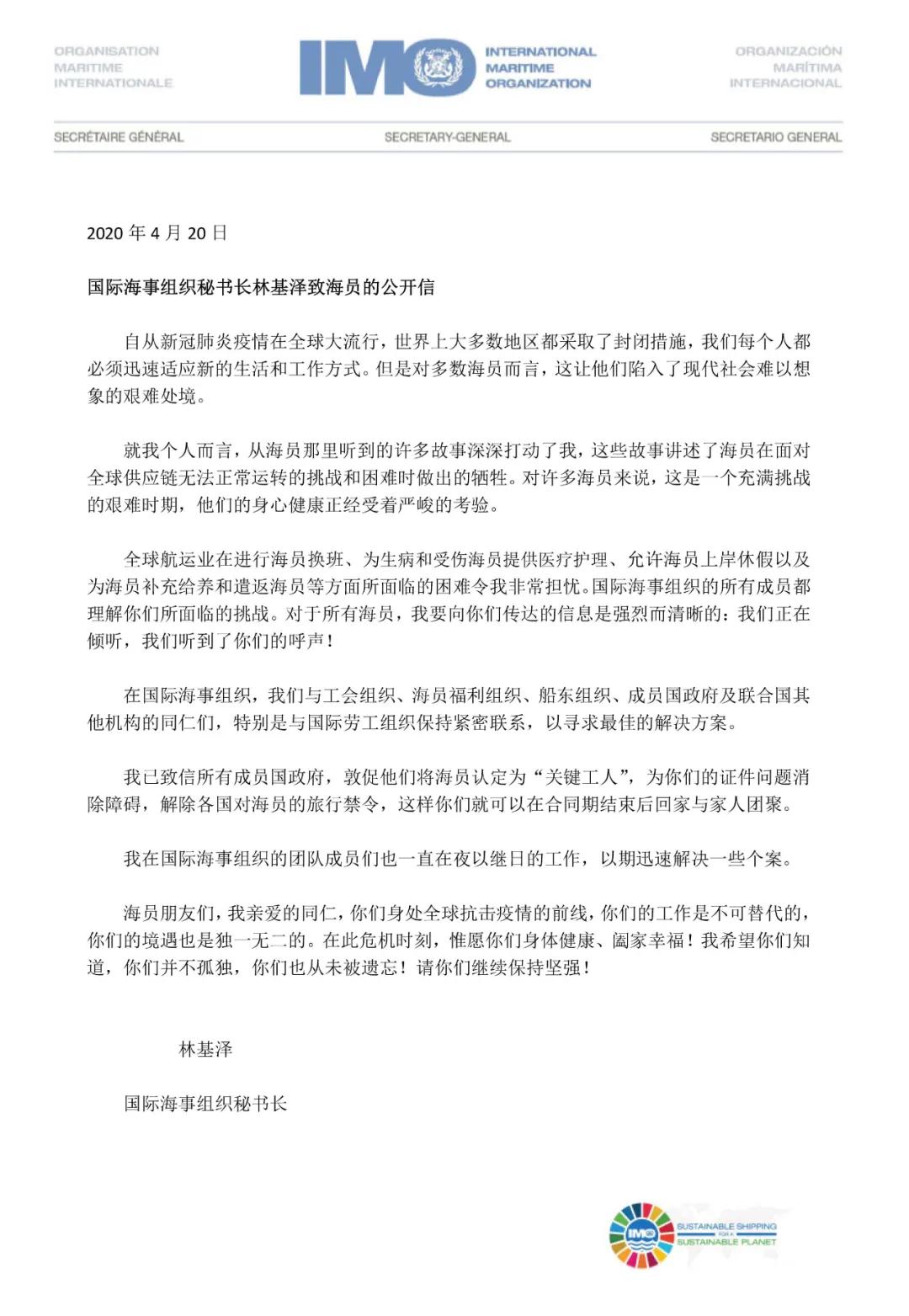 ——IMO秘書(shu) 長林基澤先生4月20日向世界各地海員的致信