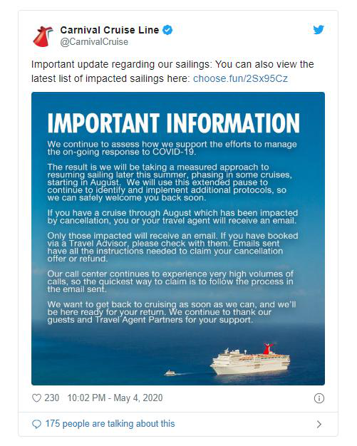 此前,受全球疫情影響,嘉年華郵輪已暫停所有航程。