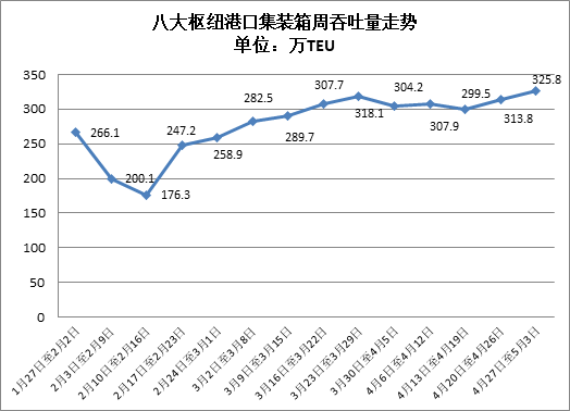 4月份,八大樞紐港口累計吞吐量同比降低5.8%,降幅與(yu) 3月基本持平。外貿吞吐量同比減少8.3%;內(nei) 貿同比增長0.3%,內(nei) 貿恢複情況明顯好於(yu) 外貿。從(cong) 目前港口反饋情況來看,5月份外貿航線空班數量較4月份將進一步增加。