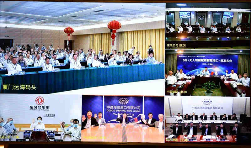 廈門市委副書(shu) 記、市長莊稼漢、中遠海運董事長許立榮、中國移動董事長楊傑、東(dong) 風公司董事長竺延風出席發布會(hui) ,共同見證了5G智慧港口在廈門遠海碼頭由試驗階段進入落地使用階段。