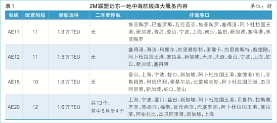 2M聯盟在遠東(dong) —地中海航線上配置四大服務(見表1)。疫情下,由馬士基航運與(yu) 地中海航運兩(liang) 大巨頭組成的2M聯盟,采取階段性暫停AE20的策略。二季度,2M聯盟共削減遠東(dong) —地中海航線52個(ge) 班期中的13個(ge) ,其中5月份削減4個(ge) 。