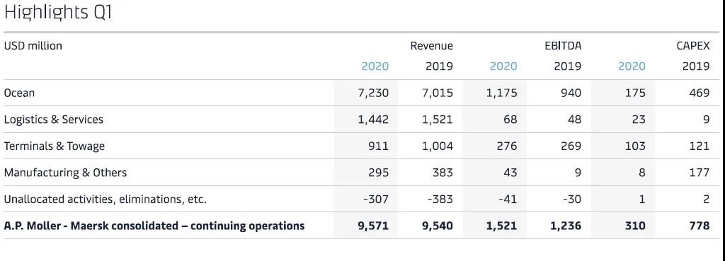 A.P. 穆勒 - 馬士基今日發布2020年第一季度財報。盡管新型冠狀病毒疫情(COVID-19 Pandemic)對全球貿易產(chan) 生了嚴(yan) 重影響,但公司開局表現良好,戰略轉型繼續進行,並表現出強大的抵禦危機能力。