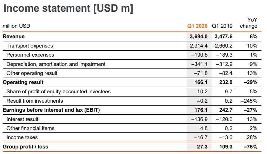 航運界網消息,5月15日,赫伯羅特發布2020年第一季度財務報告。根據財報披露,該公司一季度實現息稅前利潤為(wei) 1.76億(yi) 美元,同比減少27%;淨利潤為(wei) 2,730萬(wan) 美元,同比減少75%;息稅折舊攤銷前利潤為(wei) 5.17億(yi) 美元,同比減少6.9%。